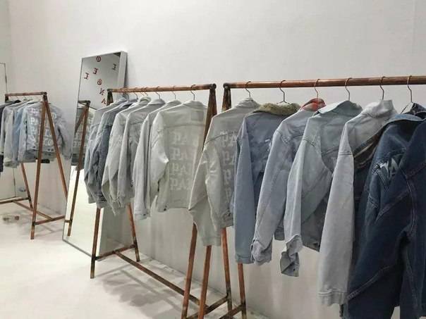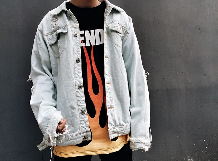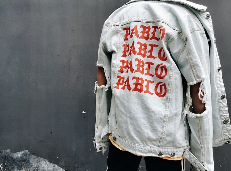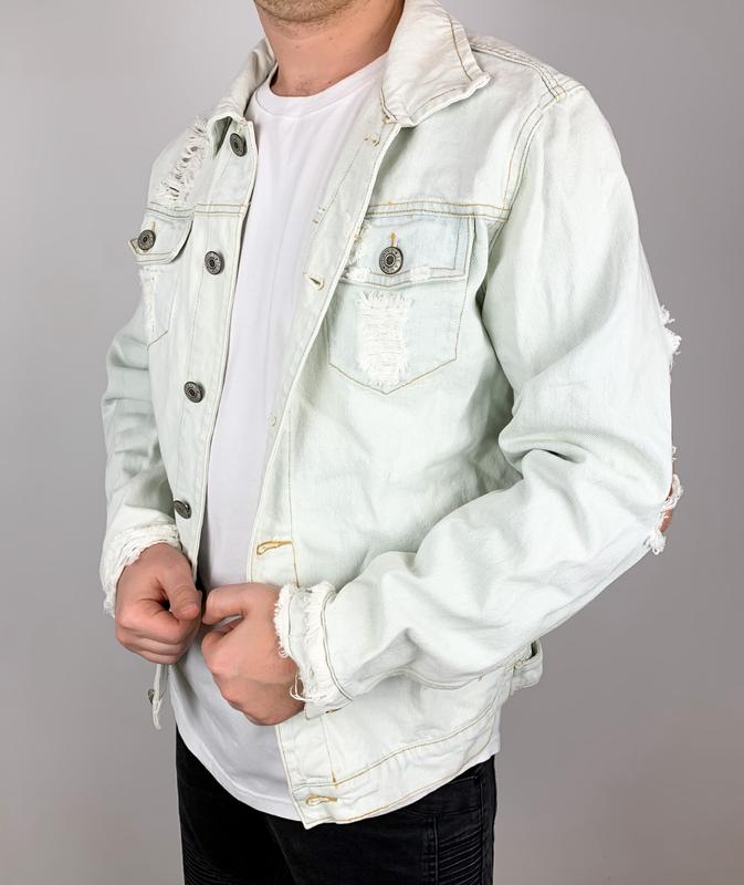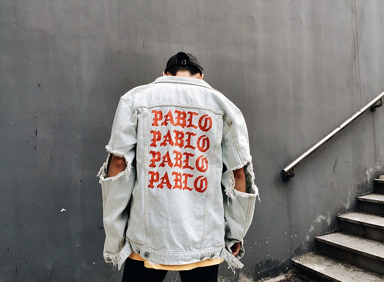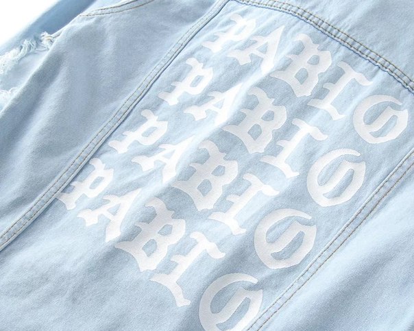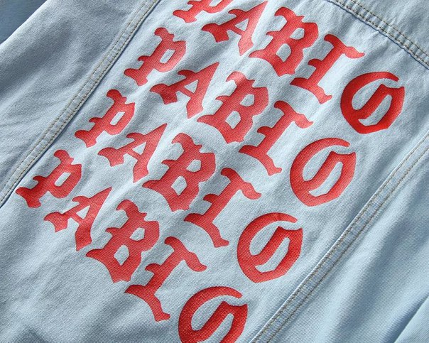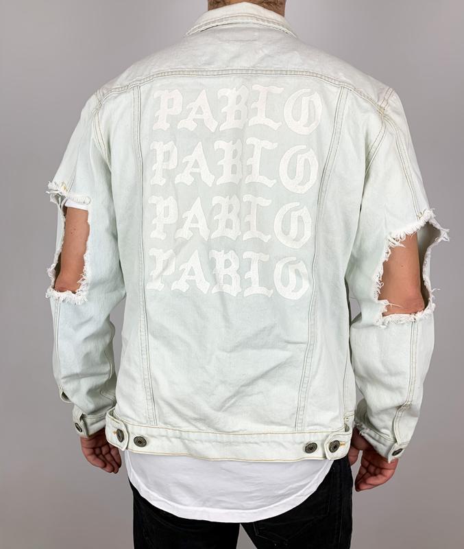 Джинсовая куртка с рваными локтями и надписью Pablo