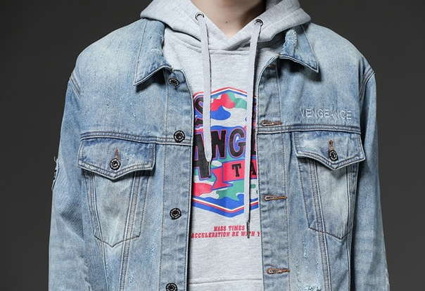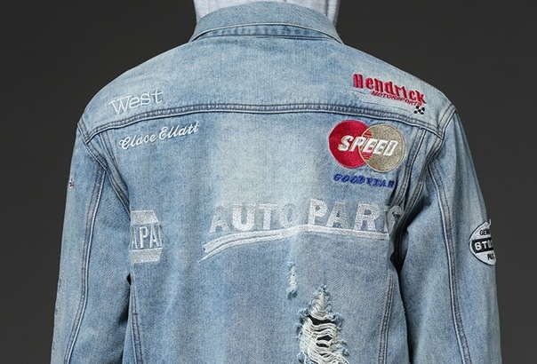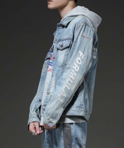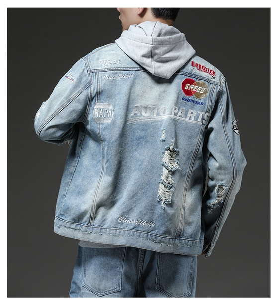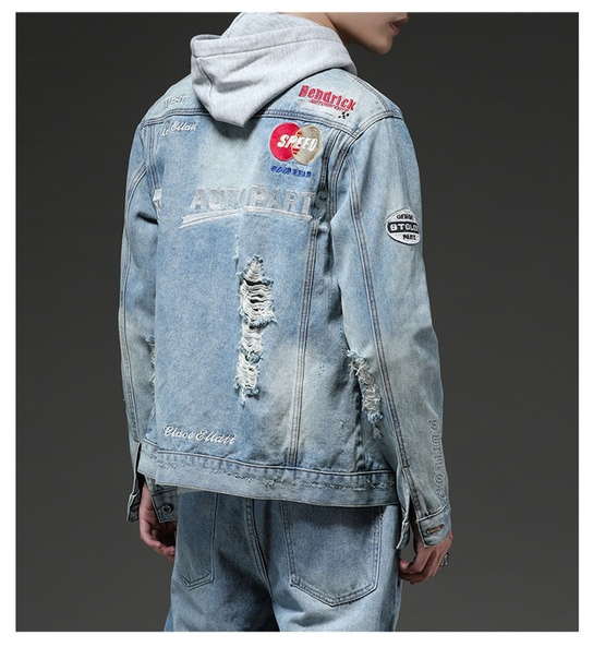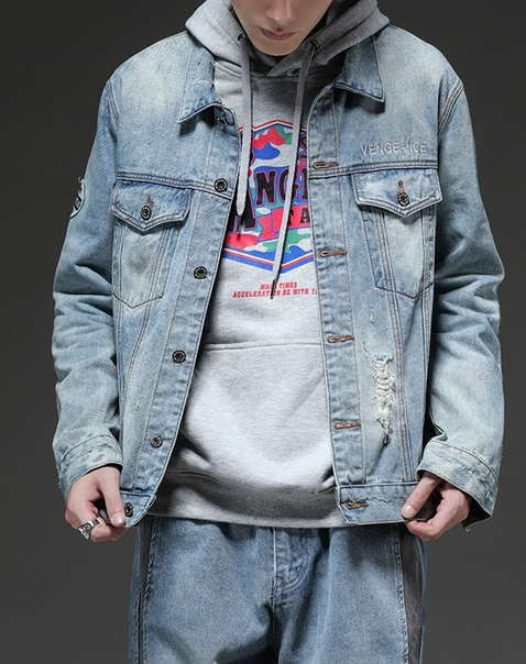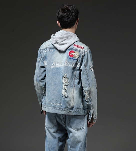 Рваная джинсовая курточка с нашивками светло синяя мужская