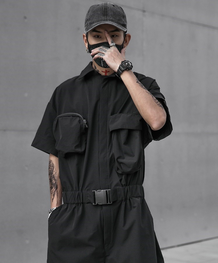 Черный комбинезон мужской короткий - шортами с карманами сзади