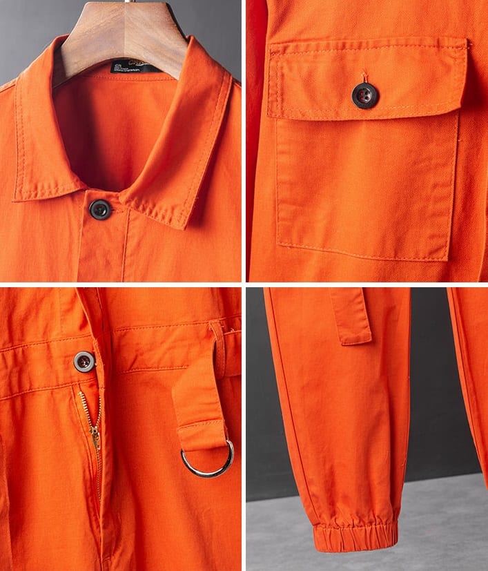 Закрытый комбенезон с рукавами доступен в цветах: оранжевый, красный, черный, бежевый, желтый, зеленый