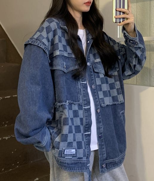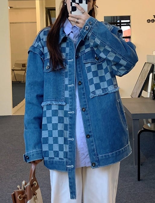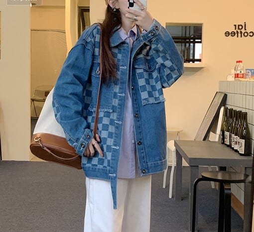 Широкая куртка джинсовая в шахматном стиле для девушки