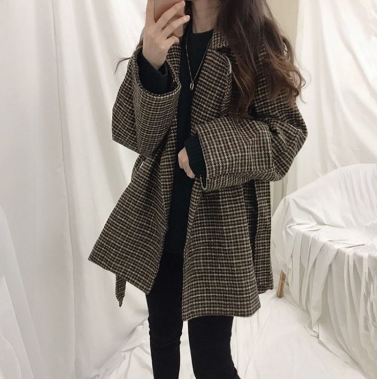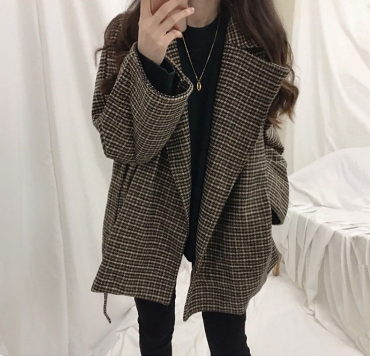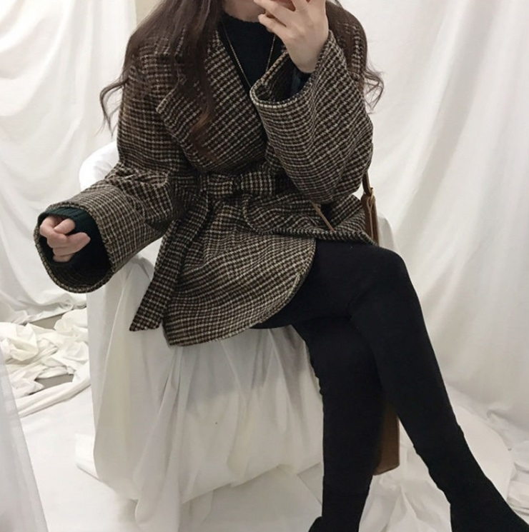 Короткое шерстяное пальто в клетку под пояс