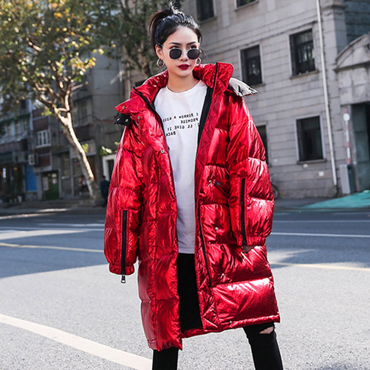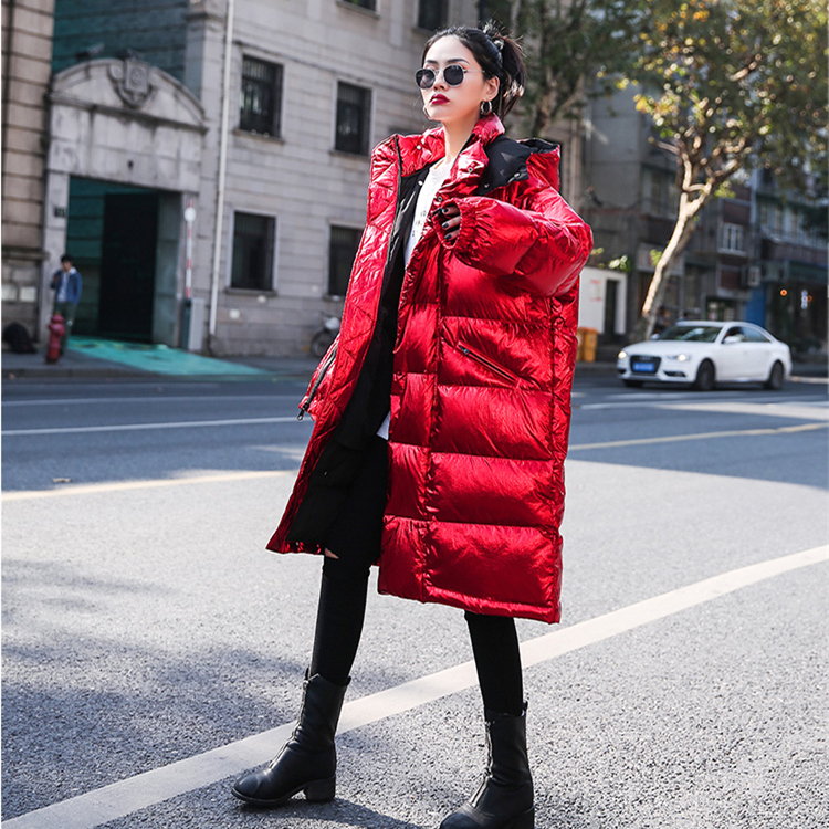 Очень длинный женский пуховик блестящего красного цвета
